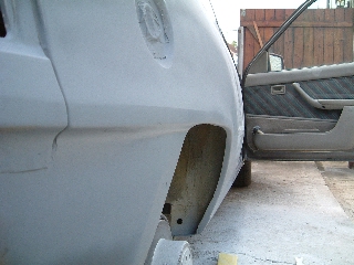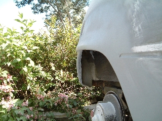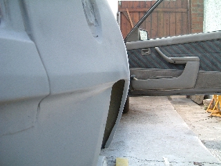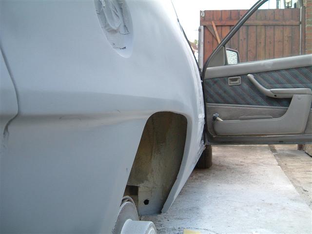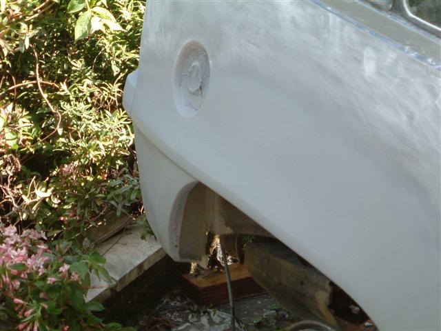 Ignore the ragged filler below the arch line - it needs more to bring it level with the surrounding material. I could do with looking at a mint original wheel arch to gauge whether my guess at shape is accurate. Look closely though and you'll see that it's slightly wavy and this will have to be sorted before paint. Misleadingly in these pictures, it looks as though the raised section gets much narrower toward the front of the arch - this isn't the case and it's all down to perspective. ;-)