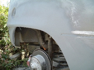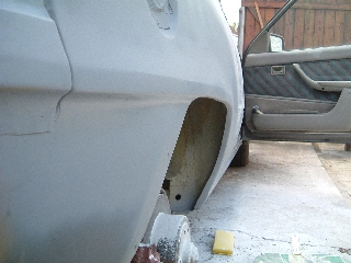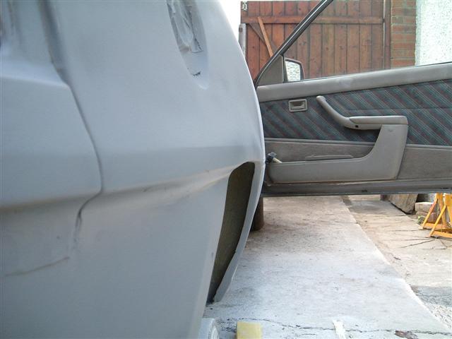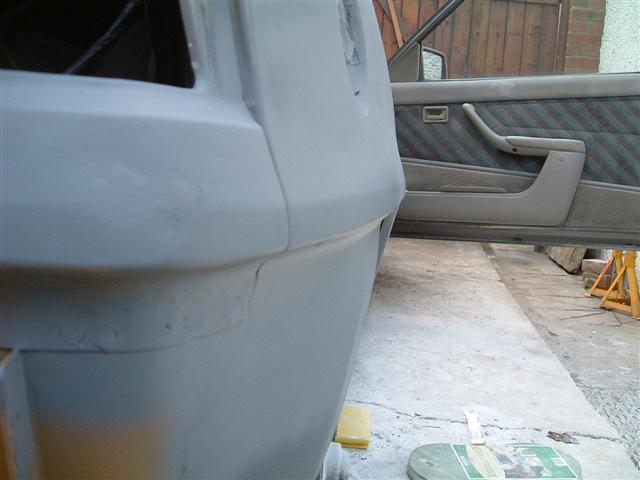 Ignore the ragged filler below the arch line - it needs more to bring it level with the surrounding material. I could do with looking at a mint original wheel arch to gauge whether my guess at shape is accurate. Look closely though and you'll see that it's slightly wavy and this will have to be sorted before paint. Misleadingly in these pictures, it looks as though the raised section gets much narrower toward the front of the arch - this isn't the case and it's all down to perspective. ;-)